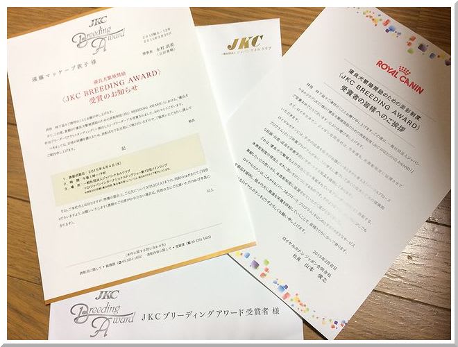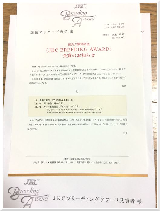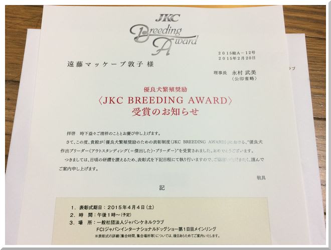 2015-03-02 JKCブリーディングアワード受賞 賞歴紹介 本部からJKCブリーディングアワード受賞のお知らせが届きました。自分が頑張ってきたことが認められるって素直にうれしいです 以前も表彰していただきましたが、何回受賞しても良いものですね 2015年4月4日(土)FCIジャパンインターナショナルドッグショー(於:東京有明ビッグサイト)で午後1時からメインリングにて表彰式です。