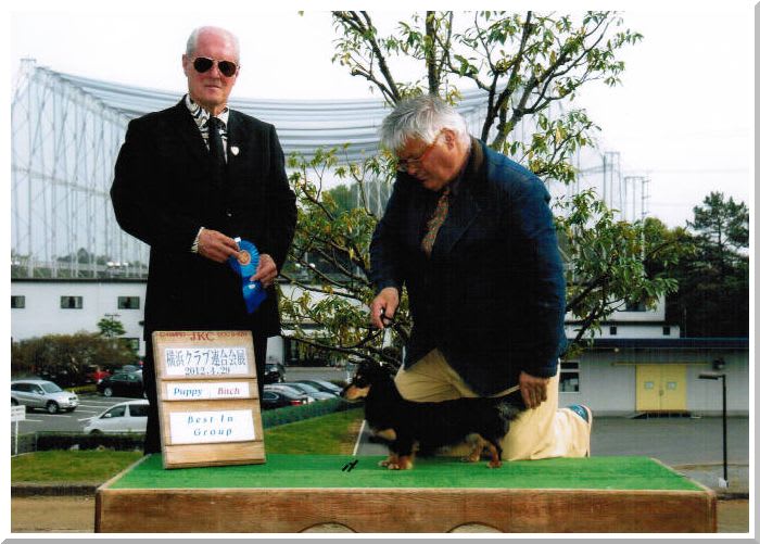 2012-05-31 JKCチャンピオン ジュエルちゃん BEATハンドリングのCH達 カニンヘンロングダックスフンド JKCチャンピオン 父:CAN.CH スター 母:JKC.CH直娘 ティアラ 呼び名:ジュエルちゃん 毛色:ブラック&クリーム S様ご愛犬