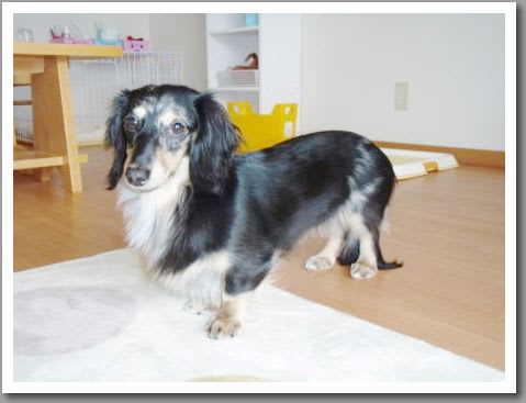 2011-08-25 サクラちゃん 巣立った子・その後 3 カニンヘンロングダックスフンド BEAT JP'S SALSA DANCE 父:JKC.CH キャロル 母:カナダCH サンバ 毛色: シルバーダップル&クリーム 呼び名: サクラちゃん トリミングでつけてもらったおリボンがとってもよく似合っています。 ママのサンバにとっても表情が似ているサクラちゃん K様ご愛犬