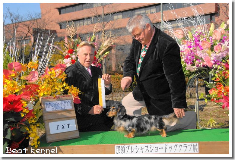 2010-10-15 JKCチャンピオン シャルル君 犬舎を支えてくれた引退犬 カニンヘンロングダックスフンド JKCチャンピオン 父:JKCチャンピオン しおん 母:JKCチャンピオン はのん 呼び名:シャルル 毛色:シルバーダップル パパがミニチュア、ママがカニンヘン登録で、もともとはミニチュア登録でしたが、チャンピオン完成後にカニンヘンへバラエティ変更しました。 ビートケンネル在舎犬 交配は引退しました