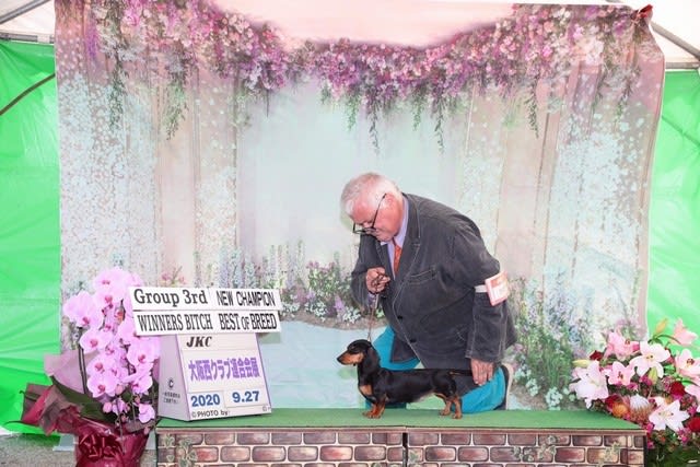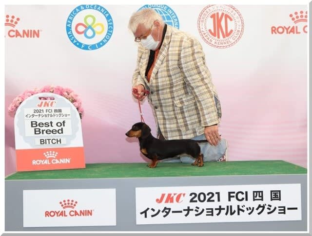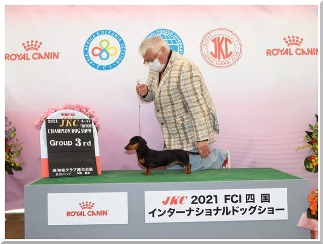 2021-11-09 インターナショナルチャンピオン ふなっしーちゃん Now Showing カニンヘンスムースダックスフンド JKCチャンピオン&インターナショナルチャンピオン INT.CH, JKC.CH HAPPY PEAR OF DOUTOR LAND JP (ハッピー ペア オブ ドトールランド ジェイピー) 父:モルドヴァチャンピオン ホーカスポーカス 母:スカイ 毛色:ブラック&タン 呼び名:ふなっしー 【O様ご愛犬】