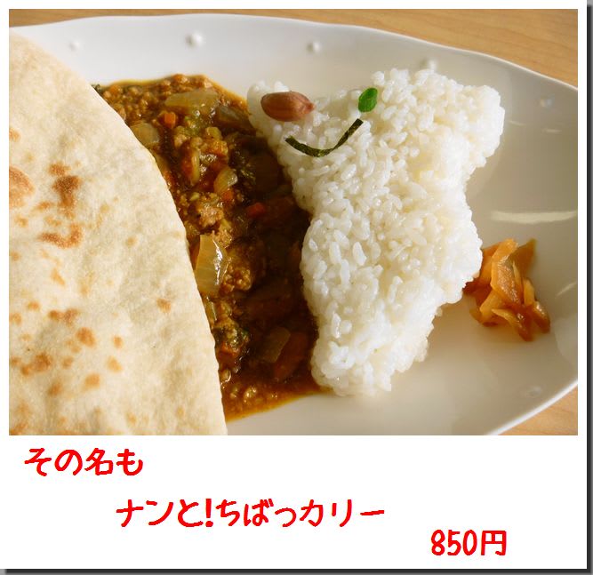 千葉県産のピーナッツがゴロゴロと入っているカレーに、焼き立てのナン、チーバ君形のライスのセットです