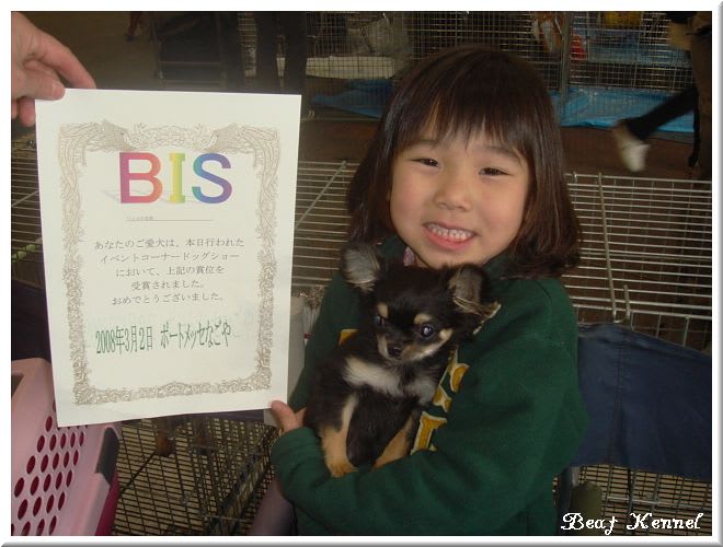 おともだちの娘のゆりあちゃん(5歳)がなんと最年少のちびちびコンビでチワワのメルシーちゃんと参加してベスト(1番)をもらいましたすごーく嬉しそうに私達のパドックへ報告に来てくれましたうまれたときからわんこに囲まれた生活なので、まだちぃさいゆりあちゃんですが、わんこの扱いはとっても上手決して乱暴な事はしないし、いつもお手伝いをしてくれる頑張りやさんです。将来有望なハンドラーさんですねぇ~~~~おめでとう~~っ
