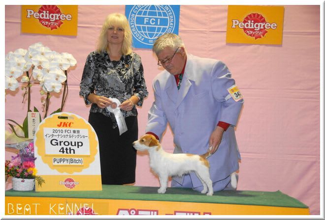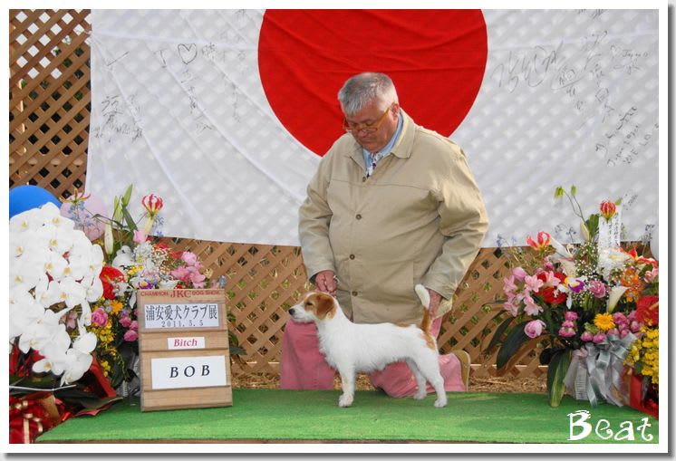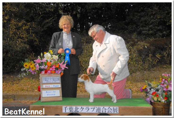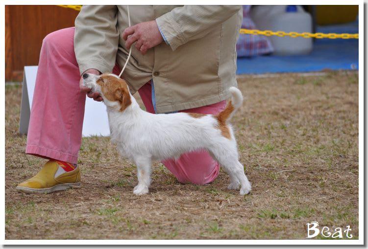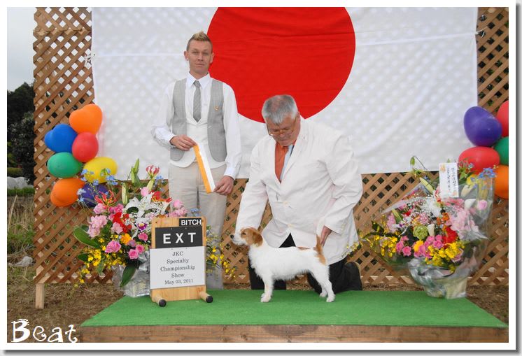 2010-12-29 JKCチャンピオン アーリアちゃん 別室:ジャックラッセルテリア ジャックラッセルテリア JKCチャンピオン 父:AUST.CH & JKC.CH ソックス 母:JKC.CH そら 毛質:ブロークン(短め) 毛色:タン&ホワイト 呼び名:アーリア オーストラリアでのショーイングも考慮して断尾はしていません。スムースに近い堅くて短めの毛質です。 N様ご愛犬