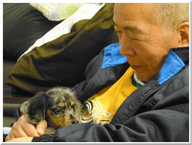 最初は、今から子犬を迎えることはこれから15年位の犬の寿命を考えると無理なのではと難色を示していた父だが、いざ抱っこしてしまえば久しぶりの子犬のぬくもりにご満悦。