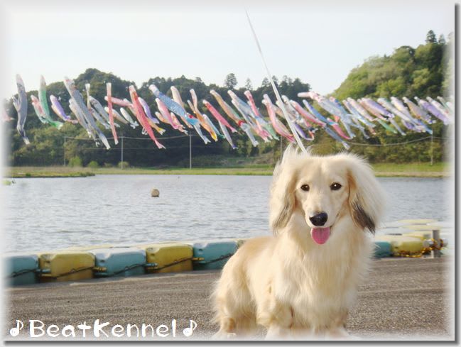 お伴はカナダチャンピオンのスター君。初めて見るこいのぼりを不思議そうに見つめてました。