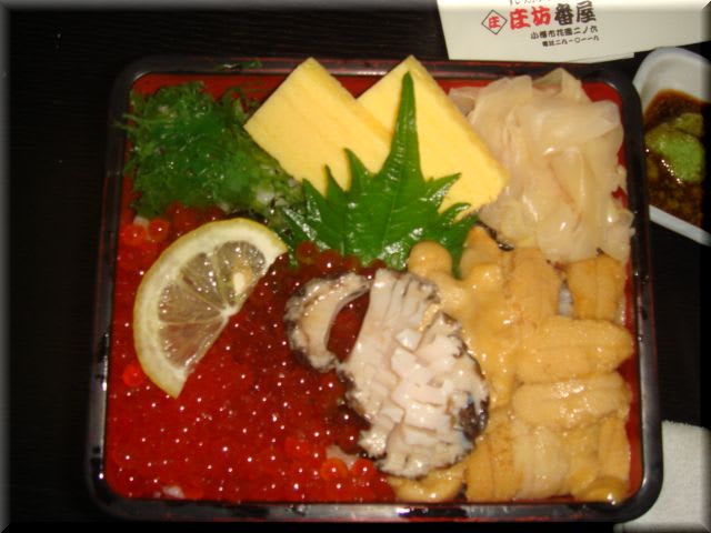 「庄坊番屋」のつぶ貝の塩焼き&うに・いくら・あわび丼