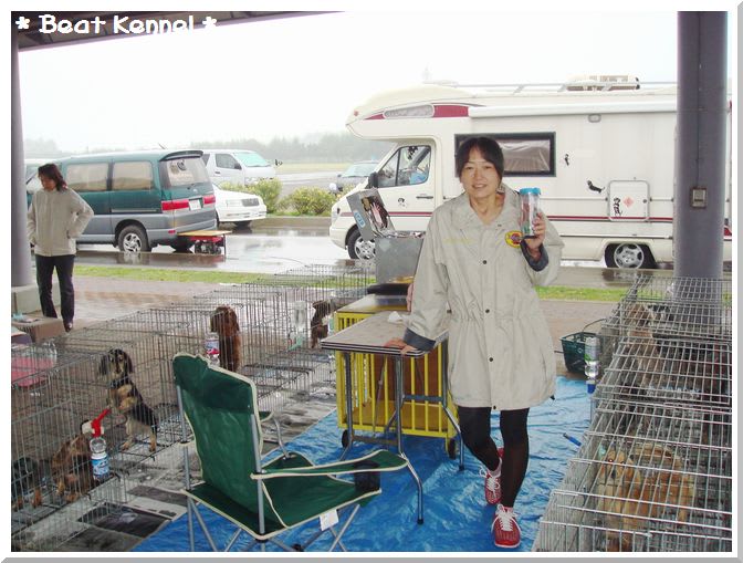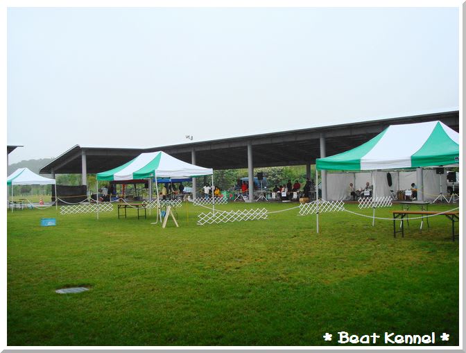 ドッグショー当日は朝から雨 そんなに降ってはいないけどとにかく寒いとても8月とは思えないほどの冷え込みにありったけの洋服を着込んでみたがベンチコート持ってくればよかったぁ・・・ ショー会場はとってもきれいで良い場所 芝生のまわりにぐるりと屋根付きの場所があるので、パドックはテントいらず あいにくのお天気なのが本当に残念。。。