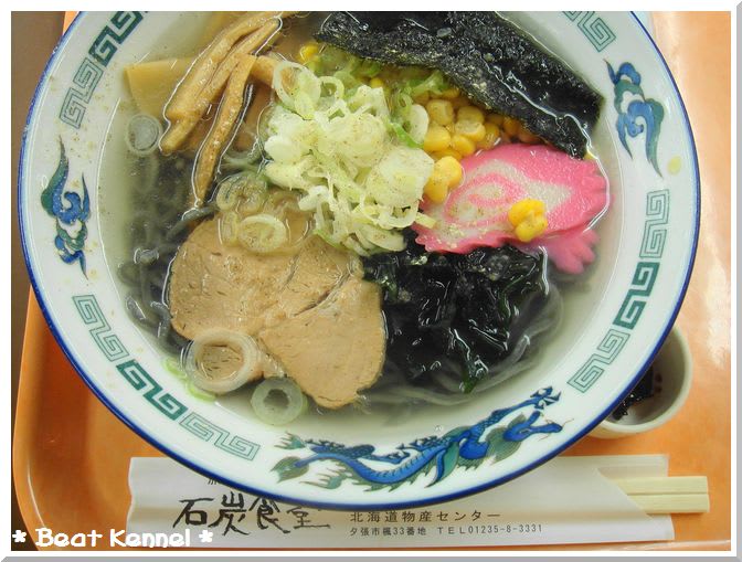 夕張で高速に乗る前にお昼ごはん 黒い麺の石炭ラーメンと石炭シュークリーム。